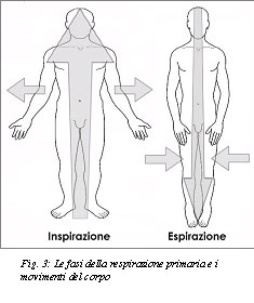 Le energie emotive e significative di me stesso si muovono e scorrono lungo il mio canale centrale. Non è difficile realizzare che l’esperienza di una emozione è composta da due aspetti, uno è il significato e l’altro è l’energia che ad esso è associata. L’aspetto energetico è quello della sensazione fisica, ad esempio lo stomaco che si chiude, il diaframma che si contrae, etc. L’aspetto del significato è ciò che in questa energia viene svelandosi. La componente energetica più profonda di me stesso (Qi, Kundalini, Shakti, Respiro della Vita, Prana) si organizza attorno alla linea mediana del corpo e può essere paragonata ad una corrente sottomarina, caratterizzata da un ritmo, un’ampiezza e una intensità. L’aspetto primario della nostra forza vitale si presenta come una pulsazione a due fasi, una ascendente, in cui l’onda sale dai piedi alla testa e una discendente dalla testa ai piedi. Una metafora spesso usata per descrivere questo movimento energetico è quella del respiro, ossia con la fase di inspirazione l’energia sale attraverso tutto il corpo verso l’alto espandendosi e con la fase di espirazione questa energia scende verso il basso restringendosi (vedi fig. 3). Il fluttuare del nostro respiro primario, così viene chiamato nella biodinamica craniosacrale, è come una marea, una forza profonda e originaria che sottende le molteplici onde della vita comune.