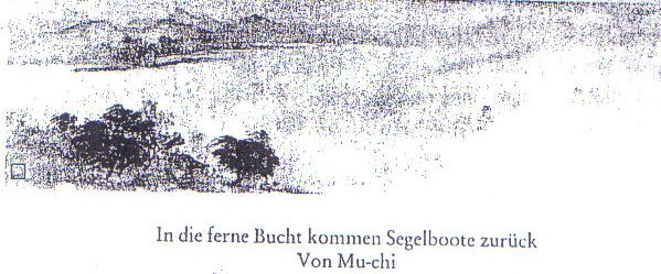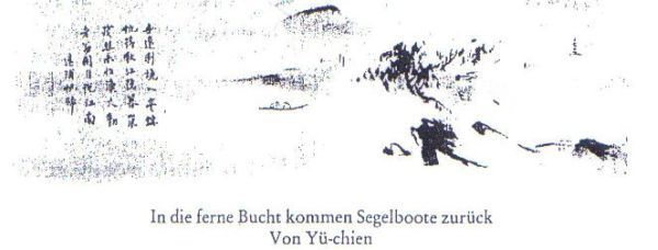 L'espressione del cuore dell'Asia orientale poggia a mio avviso sul fatto che la terra sconfinata penetra nella punta del pennello, oppure detto altrimenti, che la distanza infinita di fiume e cielo è l'infinita distanza del cuore. Il pittore, che può esprimere una cosa come questa, è quell' "uomo" che è completamente libero da ogni forma e contenuto e perciò stesso può accogliere le forme e i contenuti di volta in volta necessari. I quadri di Yü-chien, in particolare il dipinto "Nella lontana baia tornano barche a vela", esprimono, si potrebbe dire, il cuore di un simile uomo: sono i suoi "auto-ritratti" (Selbst-Bildnisse).