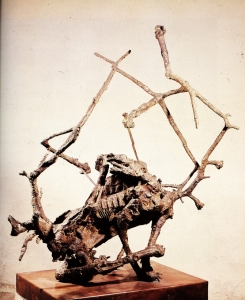 L’opera composta di elementi naturali, essenziali, potenzialmente neutri ma nell’incontro creano tensione e lotta, il cane non vuole restare intrappolato, il canneto non esprime la volontà di trattenere, semplicemente mantiene la sua struttura, diventando gabbia.