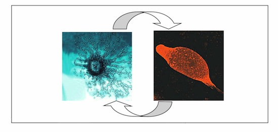 Ne è un esempio efficace Dictyostelium discoideum, una grossa ameba sociale di circa 2mm e di un bel colore giallo arancio: quando il clima della lettiera dei boschi dove vive diviene più umido e favorevole… essa scompare! O meglio, “essa” diventa “essi”, si frammenta in milioni di cellule ameboidi autonome. Al contrario, quando il loro habitat diviene troppo caldo e secco e rischiano di morire di fame, invece di darsi al cannibalismo le cellule di Dictyostelium si riuniscono in una “cooperativa”: attivano – in modo spontaneo e distribuito – un meccanismo di emissione nell’ambiente di ondate di AMPciclico, una molecola che le stimola a specializzarsi e a riunirsi in rapporti di forte dipendenza reciproca fino a formare una specie di piccolissima lumaca[ii]. Alcune cellule circolano all’interno della lumaca come sentinelle inglobando e distruggendo i patogeni con cui viene in contatto, e venendo poi abbandonate. Altre cellule si sacrificano per formare uno “stelo” sul quale si arrampicano le altre amebe e da dove formano spore per la riproduzione.