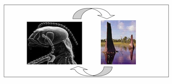 Nel caso degli insetti sociali come le Termiti, si tende in genere a dare più realtà ai confini ben definiti del singolo insetto, piuttosto che a tutta la colonia, o al termitaio di fango. Tuttavia sono proprio queste ultime identità collettive che hanno un ruolo ecologico decisivo. In aree tropicali soggette ad allagamenti, alcune specie di Termiti (Macrotermes michaelseni in Africa del Sud; Amitermes meridionalis in Australia) edificano grandi termitai di fango, capaci di ospitare fino a 5 milioni di individui per colonia. Queste strutture, durante le inondazioni stagionali, sembrano isole artificiali che sporgono dall’acqua, nelle quali la colonia di Termiti si salva “ai piani alti”; ma oltre a questo offrono rifugio a moltissimi semi di piante, a insetti e altri animali. In pratica sono delle “isole di biodiversità”, dalle quali, quando le acque si ritirano, le specie tornano a popolare la savana e a ricostruirne le relazioni ecologiche di base[iii].