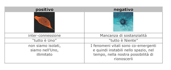 L’interdipendenza propone un’alternativa all’opposizione Io-Natura. Non si tratta tuttavia di una unità positiva del tipo “tutto è Uno”, che rischierebbe di nuovo di affermare una super-sostanza vitale, spontanea ed eterna, auto-organizzata e interconnessa in una armonia globale. Piuttosto l’interdipendenza, non salvando alcuna sostanza ultima, dà l’impressione di trovarci dentro ad una unità molto particolare in cui “tutto è Niente”. Non inteso come “non esiste”, ma in almeno altre tre accezioni: 1) i fenomeni e le relazioni sono finiti nel tempo; 2) tutti i fenomeni si riducono a un Niente di qualità e conoscenza, co-emergono ma non si fanno afferrare o definire; 3) “tutto è Niente”, nel senso che dal punto di vista della conoscenza non possiamo caratterizzare in modo stabile un mondo o una identità, perché queste caratteristiche sono in continuo cambiamento. Riprenderemo questo punto.