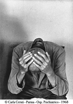 Rita Carioti - Certamente due grandi maestri della fotografia come Carla Cerati e Gianni Berengo Gardin non possono essere che considerati i protagonisti di questa variegata vetrina espositiva, non solo per la toccante bellezza estetica con la quale hanno documentato una tematica così delicata, ma soprattutto perché a mio avviso sono stati anche loro dei coraggiosi e rivoluzionari protagonisti di quel lungo e faticoso percorso che ha portato alla conquista e all’affermazione di giusti ideali a sostegno dei diritti umani, nello specifico dei malati di mente. Dalla mia personale eclettica esperienza di fotografa, sostengo che la fotocamera, in mano al professionista fotografo è uno strumento molto versatile, che può essere utilizzato come mezzo di espressività artistica, ma anche come un potente ed efficace mezzo documentaristico di denuncia di scomode realtà sociali. Lo hanno fatto in passato altri fotografi come Tina Modotti, Robert Capa, Dorothea Lange, William Eugene Smith, Diane Arbus ecc. In Italia Carla Cerati e Gianni Berengo Gardin nel 1968, dieci anni prima della applicazione della Legge 180, hanno realizzato per la prima volta, per volontà e con la collaborazione di Franco Basaglia, una documentazione, nei manicomi di Parma, Gorizia, Firenze e Ferrara, che oggi viene considerata storica, laddove nessuno prima aveva messo mai piede e hanno rivelato pubblicamente nei propri scatti l’ indecente condizione di vita dei degenti, tenuta sin allora volutamente nascosta. Credo che le immagini esposte in questa mostra, editate nel 1968 da Einaudi nel premiato libro “Morire di Classe”, così come afferma lo stesso Gianni Gerengo Gardin in una intervista rilasciata a Rossella Bigi, in parte pubblicata nel catalogo della mostra, siano certamente state determinati alla sensibilizzazione Istituzionale e Sociale al fine della approvazione della legge 180, pertanto le ho volute come protagoniste in mostra. Dopo di loro in molti hanno seguito le loro orme, tanto che in un’altra sezione negli scatti di Ferdinando Rossi si può osservare un altro scorcio di storia che raffigura la realtà manicomiale dell’O. P. di Arezzo tra gli anni 1977 al 1983, in un graduale percorso che segue la chiusura del manicomio e il superamento dello stesso dei malati, nel tentativo di costruzione di una nuova vita individuale e sociale con l’inserimento nelle case-famiglia con il supporto dei nascenti Servizi di Igiene Mentale, attuali U.S.L. La realtà odierna viene rappresentata dalle opere dei realizzate da persone con disturbi mentali che praticano le Attività Artistiche nei laboratori di Arte-terapia, che medici e operatori dei Dipartimenti di Salute Mentale di Arezzo, Firenze ed Empoli in collaborazione con specialistiche Associazioni, applicano come nuove ed efficaci metodologie di supporto terapeutico, recupero e sostegno, in quanto si rivelano efficaci veicoli che migliorano le componenti psicologiche socio-relazionali del soggetto. L’intento di questa mostra è soprattutto quello di riaffermare la “possibile” alternatività ai disumani sistemi terapeutici applicati in passato e ridare nuova luce alla preconcetta “visione” immaginativa del folle, spesso demonizzato, avvilito o emarginato, che invece, come ampiamente dimostrato, è dotato di profonda sensibilità e straordinarie spesso geniali intrinseche potenzialità. Si vuole inoltre sensibilizzare quella classe medica, che ancora oggi non “riconosce” questa palese realtà, convinta ancora oggi nella propria “indefinibile” coscienza che tra i migliori metodi per curare una mente umana vi sono quelli della contenzione e dell’Elettroshock.